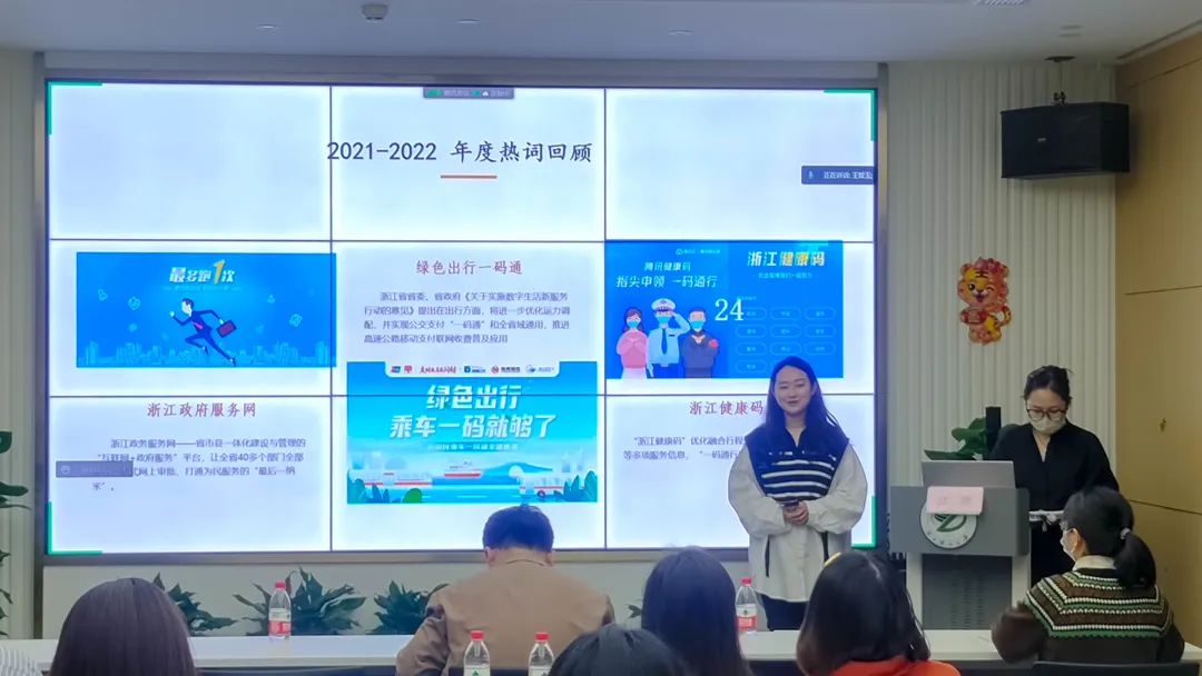 来自国际教育学院的汪珊老师从“年度热词”解码浙江共同富裕新征程,“建党百年”“乡村振兴”“疫苗接种”“小康”等热词,提炼出中国视野下的社会变迁和世界万象,“强国有我”“YYDS”传递了向上向善的时代风潮。网友热议“浙江农村有多豪华”:宁波奉化滕头村评获中国十佳自然村,以浙江之窗展现中国之治;当千年古镇乌镇拥抱互联网,数字赋能,助力浙江发展新征程;景宁畲族自治县呼应“山海协作八大行动计划”,以人为本,先行先试。人们从热词中感受的不仅是当代社会走向繁荣进步的脚步,更能读到逆行者奋斗者力担千钧的责任担当,这些具有强大凝聚力向心力的热词,都是传承红色基因的精神联结,彰显着中国人的精气神。