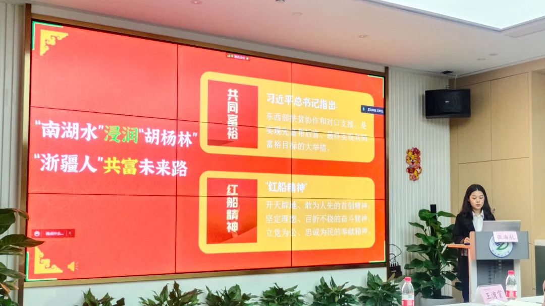 来自校团委的张海航老师以“‘南湖水’浸润‘胡杨林’,‘浙疆人’共富未来路”为题,结合自身经历,讲述了一代代浙江援疆干部建设新疆的故事。支边青年林曼欧前往新疆进行荒地勘测设计工作,援疆干部黄群超用生命诠释为民大爱,而张海航也在援疆恩师的帮助下,一步步考出新疆,考入浙江大学,并决心投入教育工作。“绝不让一个新疆人掉队”“来的时候是一粒种子,走的时候要满园硕果”……一句句质朴的话语,却是援疆干部最真诚的情感,是对“胡杨精神”“红船精神”的最好诠释。