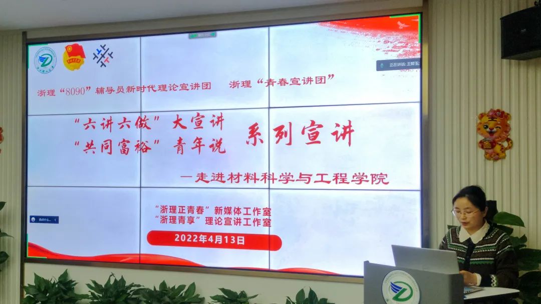 “六讲六做”大宣讲、“共同富裕”青年说系列宣讲活动走进学院的首站,由“浙理正青春”新媒体工作室、“浙理青享”理论宣讲工作室承办。校“8090”辅导员新时代理论宣讲团团长、材料学院党委副书记周照东,校团委办公室主任、组织部部长王淯霄,校团委宣传部部长张海航,入围浙江省高校思政微课大赛的老师和同学、校“8090”辅导员新时代理论宣讲团和浙理“青春宣讲团”成员代表等参加宣讲,宣讲活动由材料学院学工办主任、团委书记张姗姗主持。根据疫情防控要求,本次活动采用线上线下相结合方式进行。