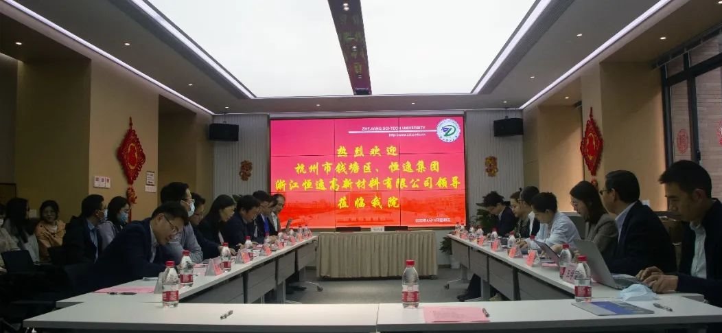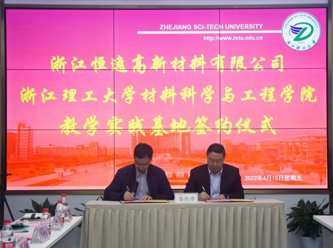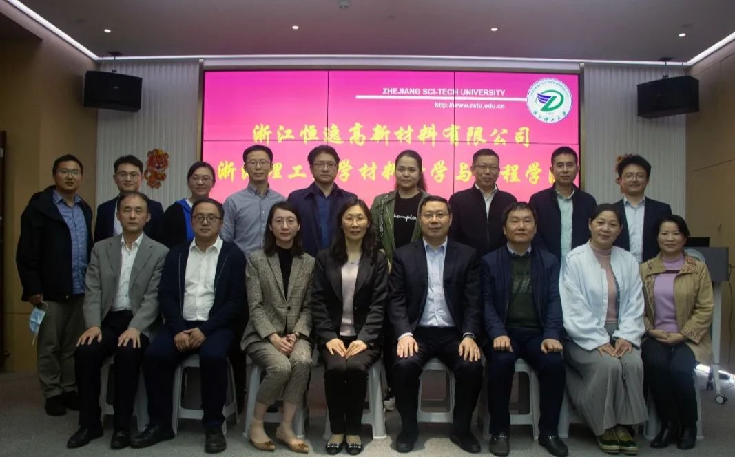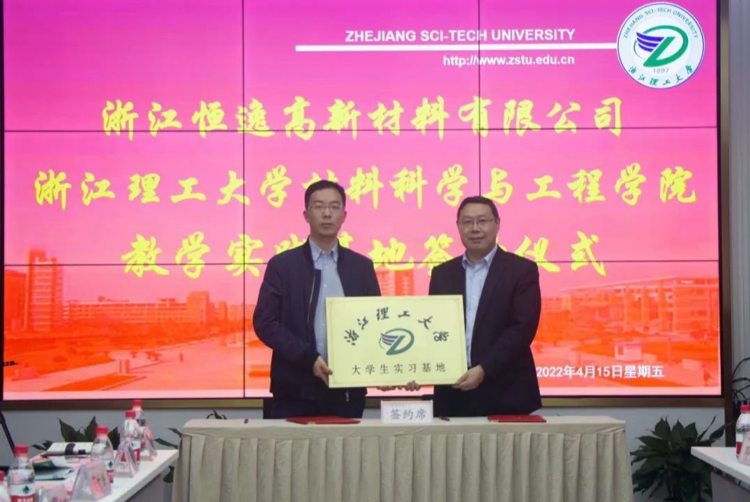 (以下简称材料学院)与浙江恒逸高新材料有限公司联合举行大学生实习基地签约揭牌仪式。杭州市钱塘区人社局副局长范哲敏、工商联副主席应群颖, 人社局就业处主任周磊,恒逸集团人力资源部总经理薛丽莉、浙江恒逸高新材料有限公司总经理董庆奇及公司相关负责人,材料学院全体党政班子成员、高分子系负责人和部分毕业生代表等出席活动,仪式由钱塘区政协委员、材料学院刘向东教授主持。