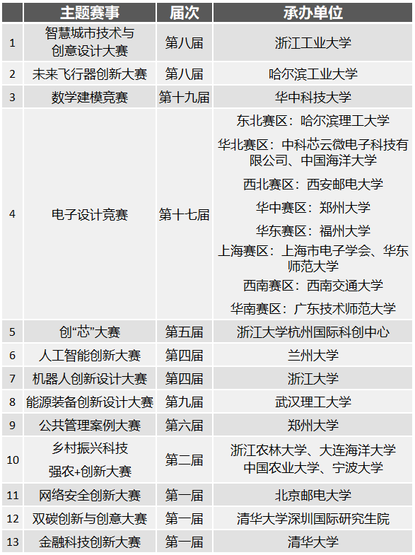中国研究生创新实践系列大赛创立于2013年,旨在以竞赛的方式鼓励研究生勇于创新、勤于实践,提高研究生的创新能力和实践能力。2022年,大赛配合教育部“国家急需高层次人才培养专项行动”和“卓越工程师产教联合培养行动”,共设置如下13项主题赛事。相关赛事介绍、赛程安排、赛事指南可登录中国研究生创新实践大赛网站(网址://cpipc.acge.org.cn/)查看并注册报名。