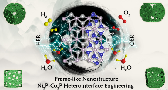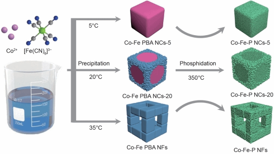 基于类普鲁士蓝材料组成和结构的可调控性,作者利用类普鲁士蓝作为前驱体,通过选择性外延生长/化学刻蚀–磷化处理策略设计合成具有复杂纳米框架结构的过渡金属磷化物。在第一项研究中(Sci. China Mater. 2021, DOI: 10.1007/s40843-021-1743-7),作者发现钴铁类普鲁士蓝前驱体生长受到温度调控,伴随反应温度从5℃升高到35℃,产物结构由实心纳米立方体转变为空心纳米框架,研究发现纳米结构的转变与纳米立方体棱角位置的选择性外延生长相关,升高反应温度将触发前驱体分子内的电子转移并诱导结构转变,所制备的钴铁磷化物纳米框架表现出优异的电催化析氧活性。在另一项研究中(Chem. Mater. 2021, 33, 9165),作者利用镍钴类普鲁士蓝作为前驱体,采用选择性化学刻蚀–磷化处理策略设计合成了一种Ni2P-Co2P异质结纳米框架催化剂用于高效电催化析氢、析氧以及全水解,通过系统的实验和理论计算相结合,揭示了Ni2P-Co2P异质结调控优化催化剂本征析氢活性的机理,并明晰了纳米框架在提升催化活性位点数目和传质扩散方面的结构优势。
