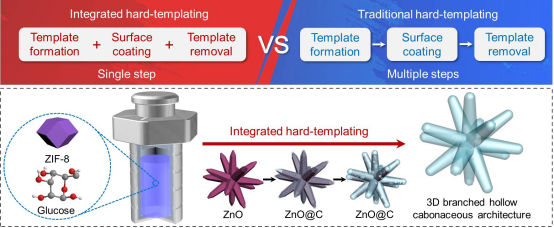 传统硬模板法是构建空心结构最普适的策略,可根据应用需求对空心结构进行设计调控,但是该策略存在模板制备、材料包覆和模板去除等多个繁琐分步骤。针对传统硬模板法的局限性,作者思考能否调控反应顺序和进程实现模板制备、材料包覆和模板去除这三个分步骤在同一反应空间内有序的先后启动,例如硬模板首先快速反应形成,接着目标材料(或前驱体)开始在模板表面包覆,并能原位产生刻蚀剂去除内部模板。如此,这种集成化的硬模板法(或称为集成硬模板法)将突破传统硬模板法的局限,有效简化空心结构的制备流程。在第三项研究中(Sci. Bull. 2021, DOI: 10.1016/j.scib.2021.10.008),作者基于金属有机框架ZIF-8和葡萄糖的水热特性首次报道了一种独特的“集成硬模板法”用于制备复杂三维空心枝化结构碳材料,其作为电极材料或基底电极(导电载体)时均表现出优异的超级电容器性能。