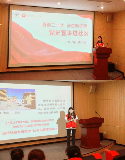 马克思主义学院红信讲习团成员王志娟在《喜迎二十大,奋进新征程,党史宣传进社区》的主题宣讲中,用饱含深情的语言、生动鲜活的事例讲述了中国共产党带领人民站起来、富起来到强起来的百年奋斗史,引导社区的中小学生争做有志气、有骨气、有底气的新时代青少年。红信讲习团成员叶子怡以《坚持党对一切工作的领导》为主题,从青年的视角讲述坚持党对一切工作领导的重要性。她在宣讲中提到,“作为青年,应当把对祖国的热爱和党的要求统一起来;把对自我认知的审视与组织纪律的约束统一起来。”