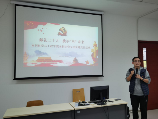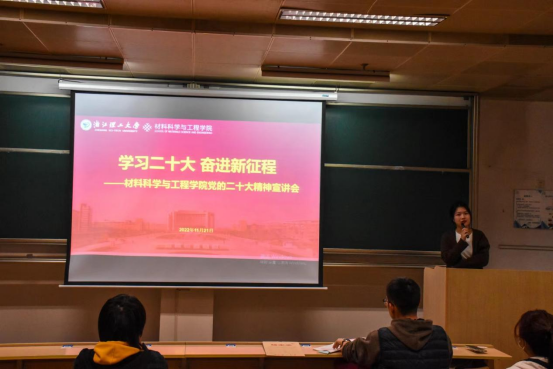 为深入学习宣讲党的二十大精神,学院全体辅导员统筹谋划,多时段、多阵地、多方式深入学生群体中开展宣讲,形成并构建了“年级-班级(办公室)-寝室”网格化、“接地气”的宣讲机制。辅导员王依琳面向大一和研一同学开展“安全伴我行 共筑中国梦”主题宣讲,从校园安全讲到国家安全,教育引导新生培养安全意识,遵守法律法规、校规校纪,牢固树立和践行总体国家安全观,倡导构建人人有责、人人尽责、人人享有的安全共同体。辅导员鲁宏浩走进研究生日常学习的办公室,和学生们围坐一起学习党的二十大报告,针对报告中“实施科教兴国战略,强化现代化建设人才支撑”的篇章进行了解读,引导同学们树立材料强国梦,积极开展科研,勇担社会责任,为全面建设社会主义现代化国家贡献自己的智慧和力量。辅导员魏厚钱通过走访宿舍,深入学生寝室,面对面进行党的二十大精神学习感悟交流,以交流分享式开展理论宣讲,把党的二十大精神带到学生身边,打通学习宣传贯彻工作的“最后一公里”,让学习党的二十大精神在每间宿舍蔚然成风、遍地开花。