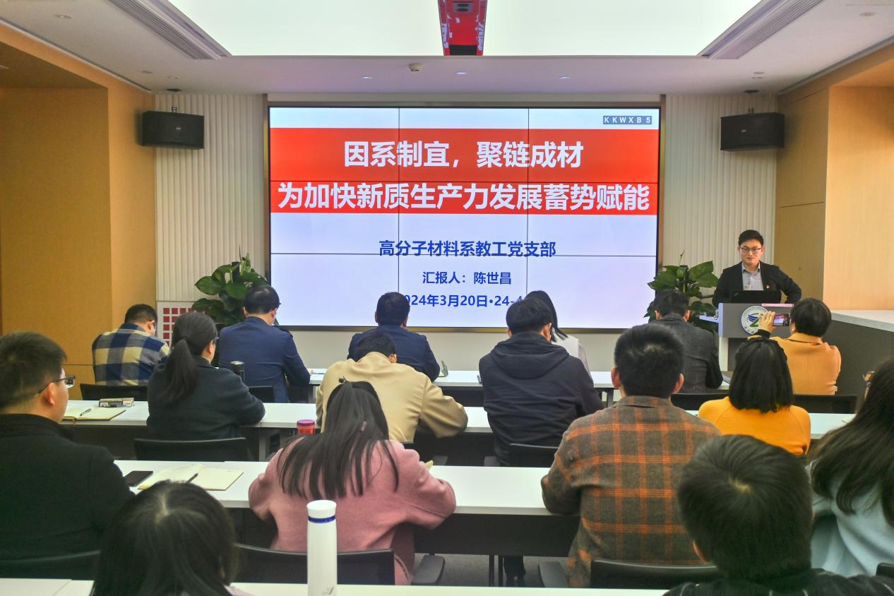 陈世昌老师代表高分子材料系教工党支部以“因系制宜,聚链成材。为加快新质生产力发展蓄势赋能”为主题向大家分享了自己对于新质生产力的认识,讲述了支部成员采用科技创新技术为企业赋能发展的典型事迹,并表示将以加强学科建设、培养创新型人才、推动高质量发展为目标,发挥党支部战斗堡垒作用,努力为学校高水平大学建设、学院高质量发展积极贡献力量。