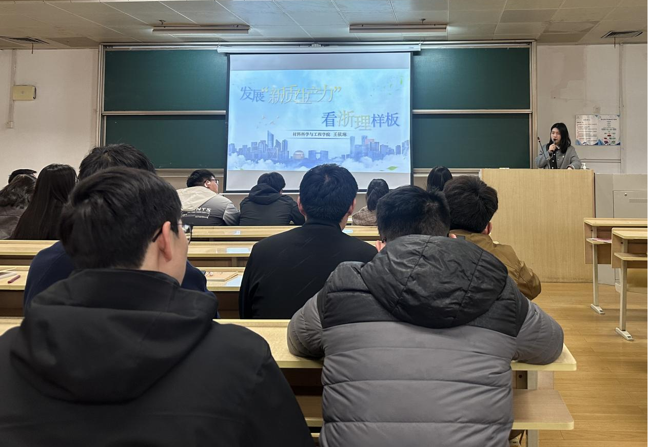 学校8090新时代辅导员理论宣讲团成员、研究生材料科学与工程第一党支部书记王依琳老师结合实际进行全国两会精神专题宣讲,她以“发展新质生产力的浙理样板”为题,向大家讲述了全国高校黄大年式教师团队—纤维材料科学与工程教师团队打造科创“新高地”、赋能产业“新发展”、助力新质生产力的生动故事,加深了师生党员对于新质生产力的理解,进一步推动全国两会精神入脑入心入行。