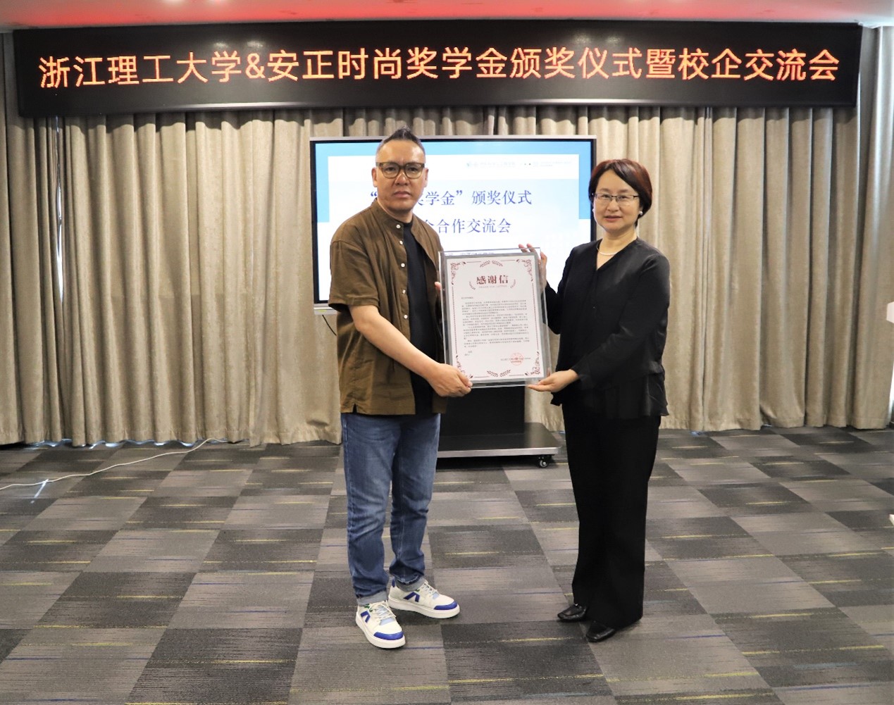 校对外联络办公室主任陈艳宣读2022-2023学年“安正奖学金”获奖名单。安正时尚集团公司党委书记、董事长郑安政为获奖学生颁发证书。
