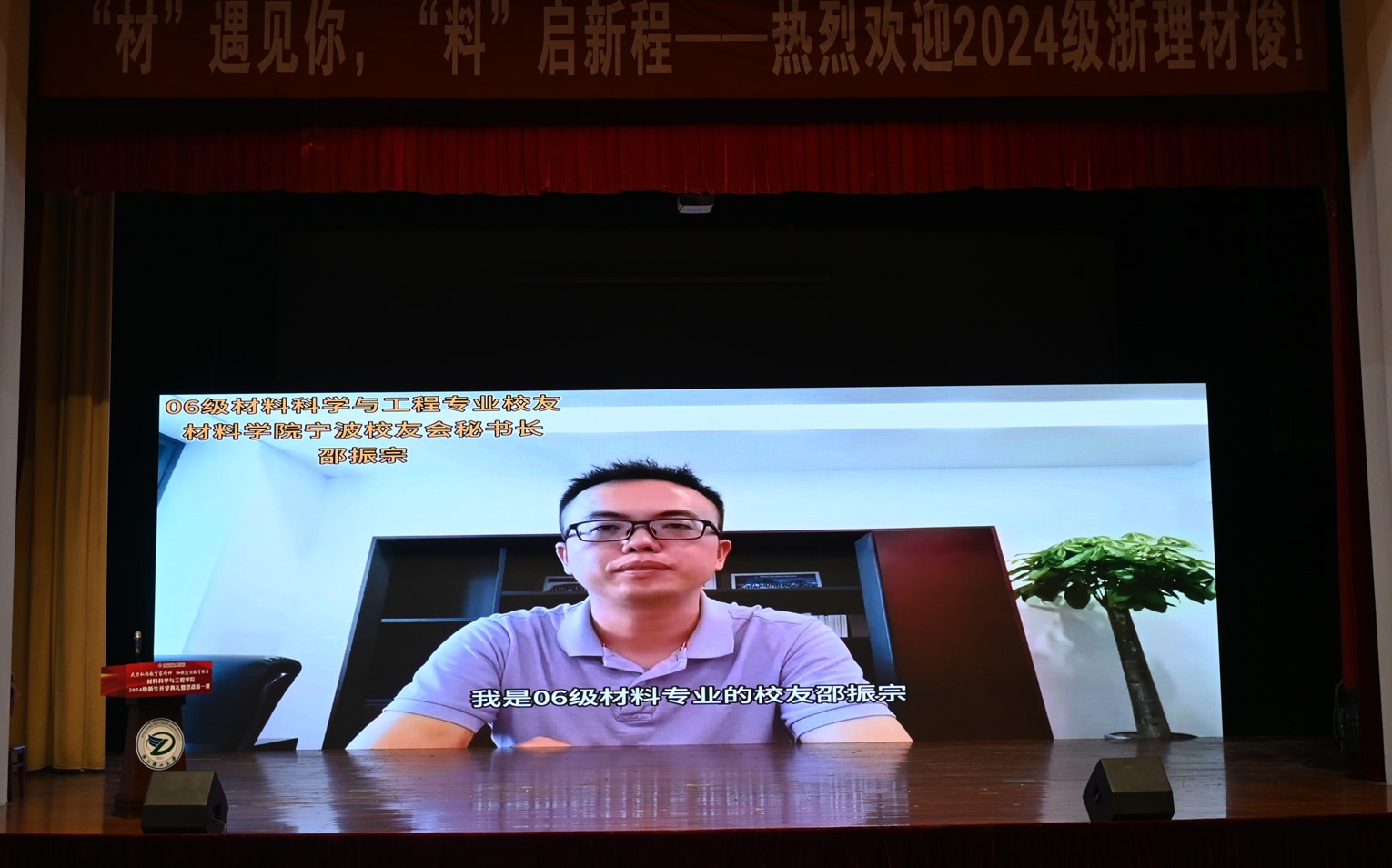 学院邀请历届优秀校友代表给新生们带上远程祝福。12级材料物理化学专业校友、材料学院宁波校友会长欧阳申珅给学弟学妹们分享了自己的大学经历,她希望大家在浙理的平台上努力尝试挑战,突破自我,成长为更优秀的自己;06级材料科学与工程专业校友、材料学院宁波校友会秘书长邵振宗希望学弟学妹在努力学习的同时积极参加学生工作,广交朋友,综合提升自我,在浙理成长为更好的自己;05级材料学专业校友、材料学院杭州校友会秘书长白利强结合自身成长经历寄语学弟学妹:在学习生活中要全力以赴拼搏,不要轻言放弃,勇敢面对困难,祝大家在浙理学的开心,玩的快乐,让浙理成为人生中最美好的一站!