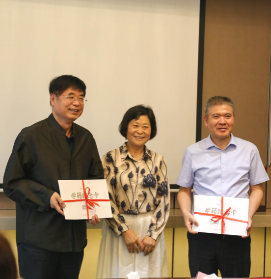 班主任潘水凤向周文峰、盛建祥两位校友赠送承载青春回忆的学籍纪念卡。