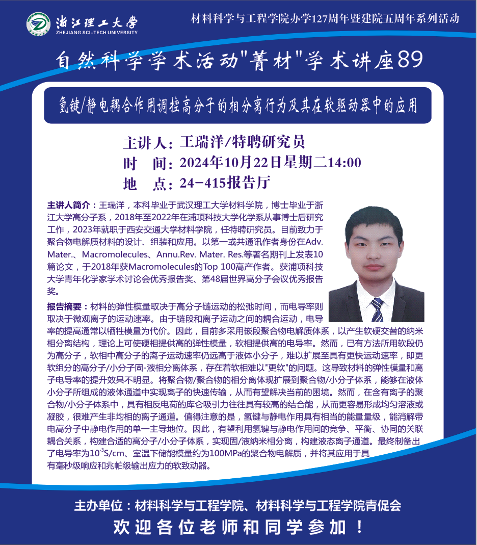 学术讲座【89】:氢键/静电耦合作用调控高分子的相分离行为及其在软驱动器中的应用