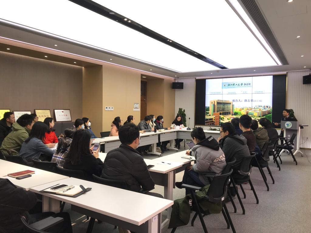 为提升教育教学改革水平,帮助老师们更好地凝练教育教学成果,写好教改论文,1月20日下午,材料工程系举办了2021年第一场基层教学组织活动,邀请了《糖心vlog 学报》副主编唐志荣老师和社科版编辑陈丽琼老师来院交流,杨叶锋副院长参加座谈会,会议由系主任金达莱老师主持,约50名教师参加座谈会。
